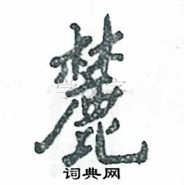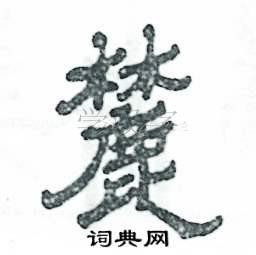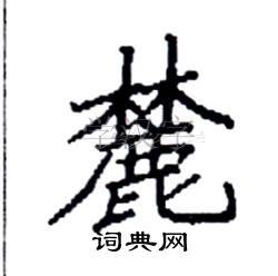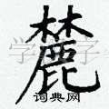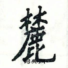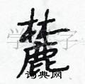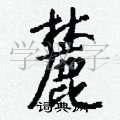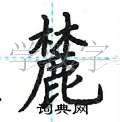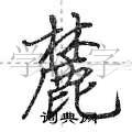 2. 右侧的“鹿”字部分,要注意结构平衡。上面两个点的位置要适当,不可过于靠近或远离。下部写的横折钩与内部填充的部分要有紧凑感和协调性。特别是注意最上方的撇与下面结构的连贯性和层次过渡自然。最后写“鹿”字上方的横折钩时,钩的方向要适中,不宜过于倾斜或过于平直。